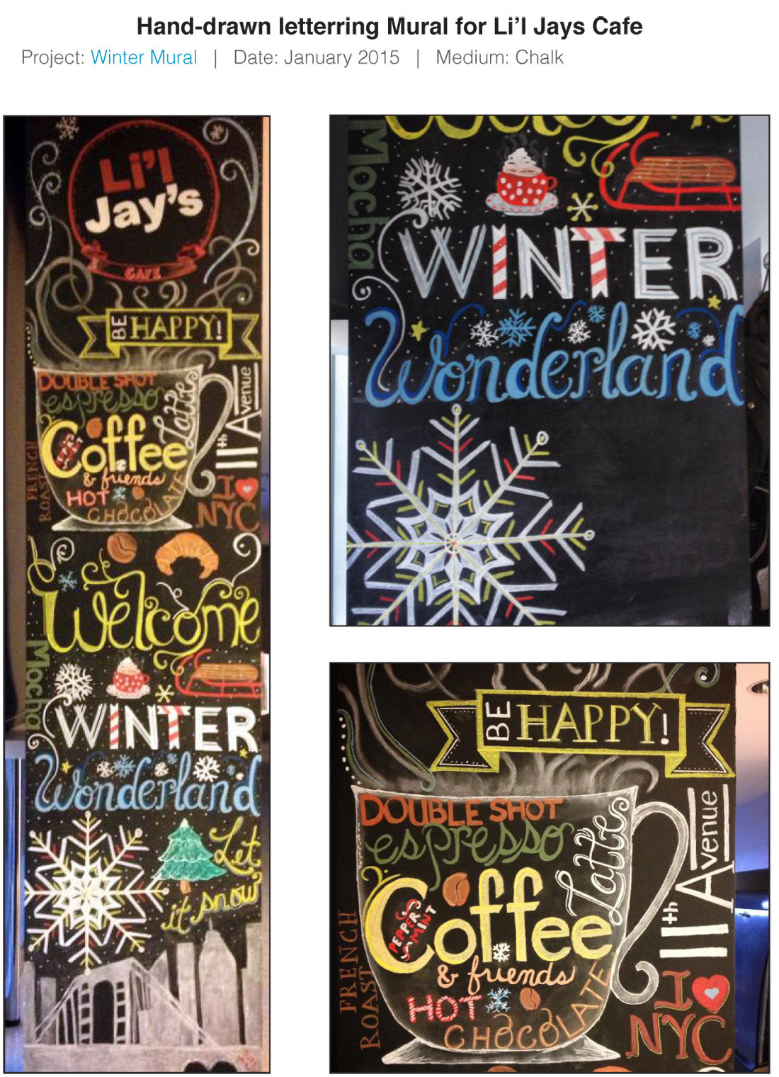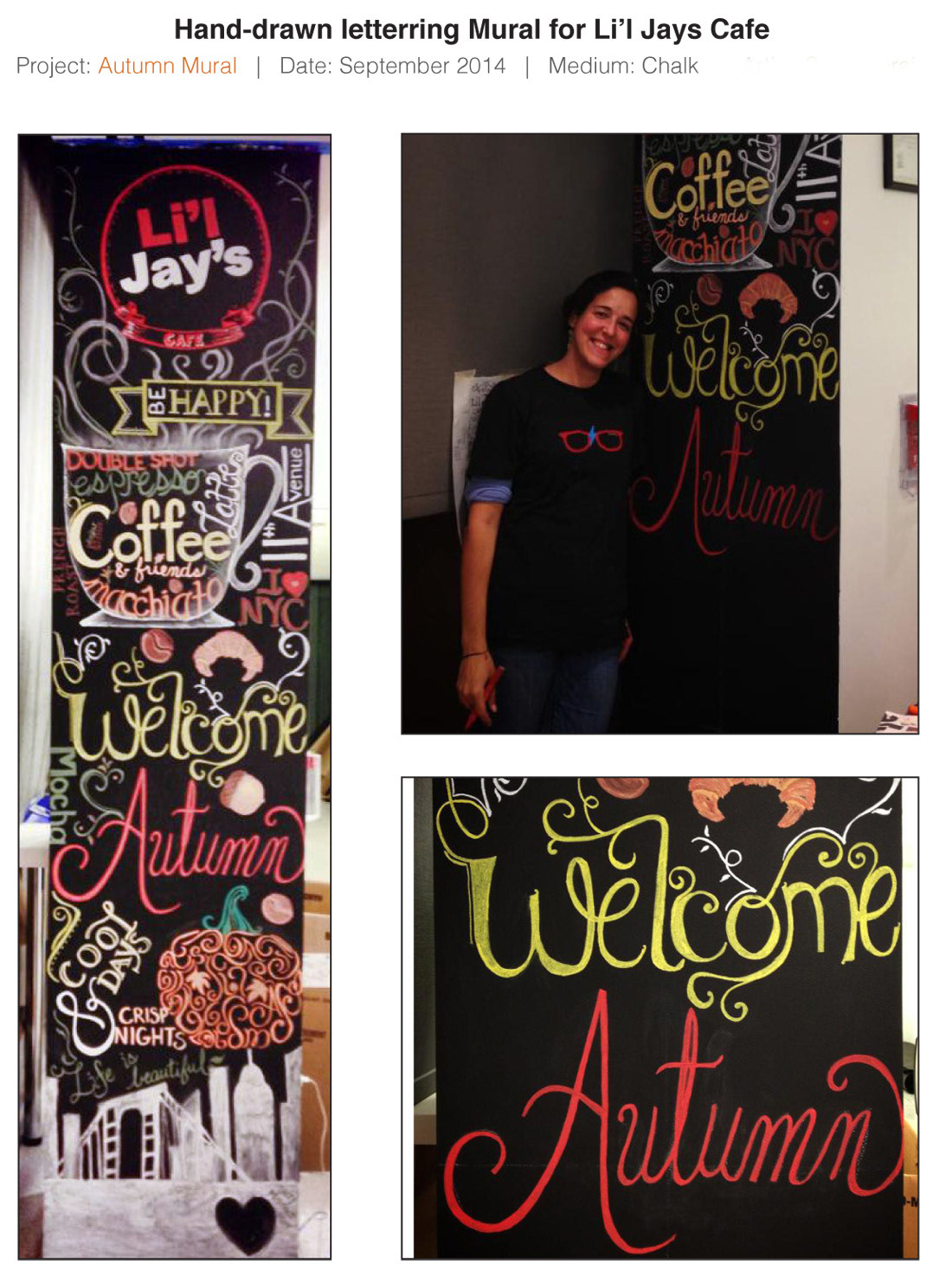 Hand-drawn lettering and chalk mural designed seasonally for Lil' Jays coffee shop in NYC.